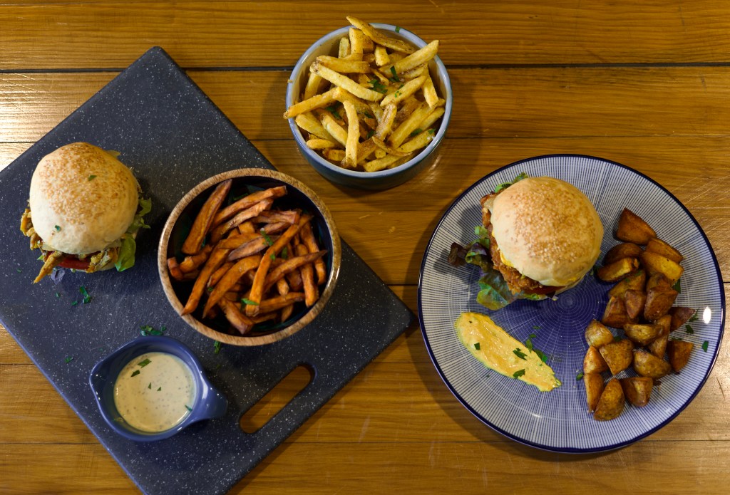 Pain burger, sauce barbecue, poulet frit, bacon, comté, oignons frits.